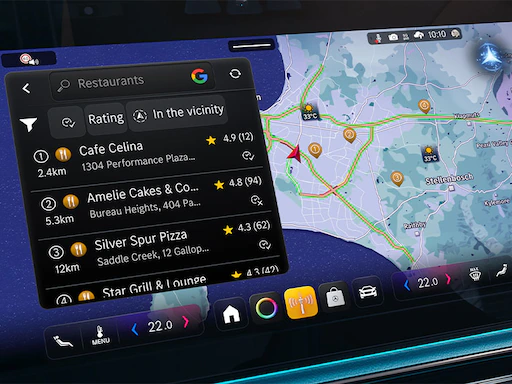 Die integrierten Google Maps-Daten bieten Vorschläge für Ziele und alternative Routen und vereinen so das Beste aus beiden Welten: Echtzeit-Verkehrsinformationen von Google und die intuitive Benutzeroberfläche von Mercedes-Benz.