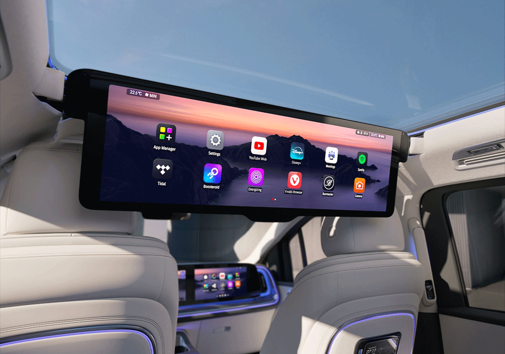 Das optionale, ausfahrbare Display bietet Infotainment auf höchstem Niveau. Ob Filme, Gaming oder Videokonferenzen – dank Split-Screen-Funktion ist sogar beides gleichzeitig möglich. Bei Nichtgebrauch verschwindet das Display elegant im Dachhimmel.